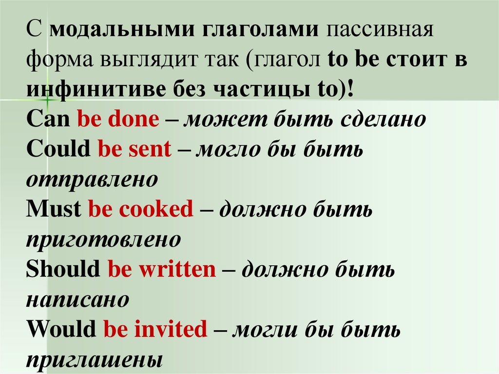 С модальными глаголами пассивнаяформа выглядит так (глагол to be стоит в