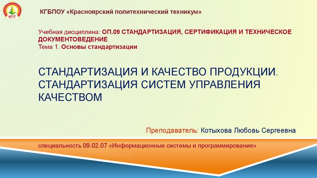 КГБПОУ «Красноярский политехнический техникум»Учебная дисциплина: ОП.09 СТАНДАРТИЗАЦИЯ, СЕРТИФИКАЦИЯ И ТЕХНИЧЕСКОЕ
