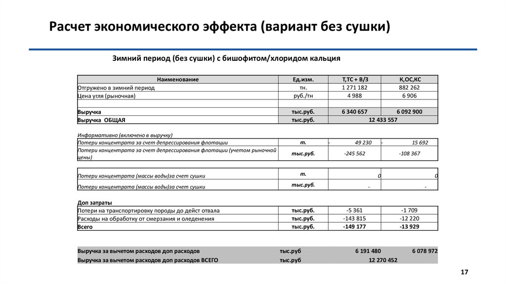 Расчет экономического эффекта (вариант без сушки)Зимний период (без сушки) с бишофитом/хлоридом кальция