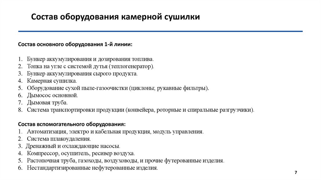 Состав оборудования камерной сушилкиСостав основного оборудования 1-й линии: