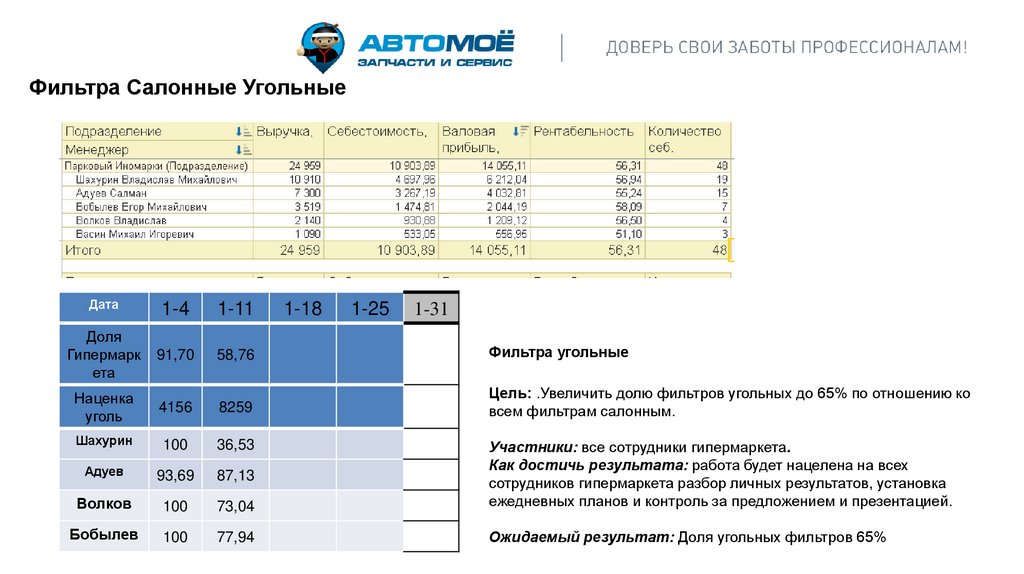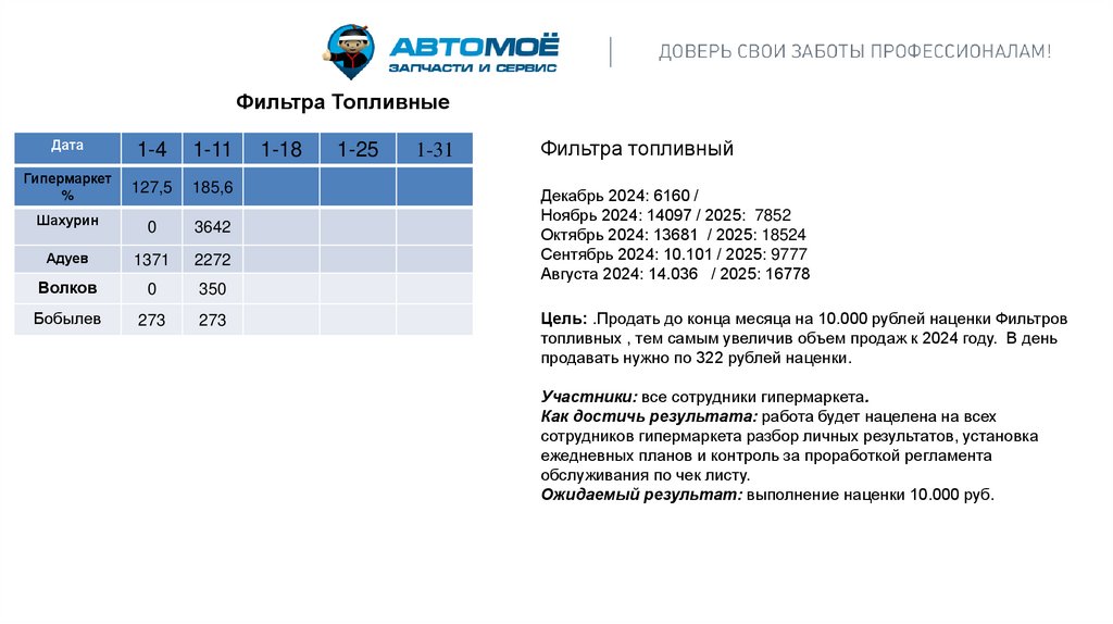 Цель: .Продать до конца месяца на 10.000 рублей наценки Фильтров