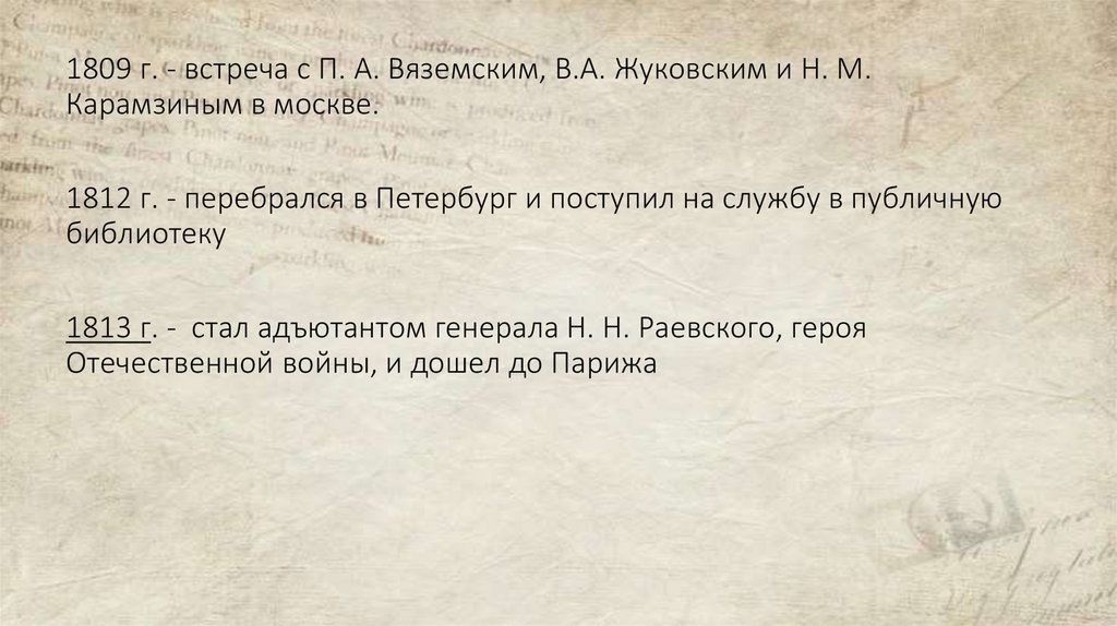 1809 г. - встреча с П. А. Вяземским, В.А. Жуковским и Н. М.Карамзиным в москве.