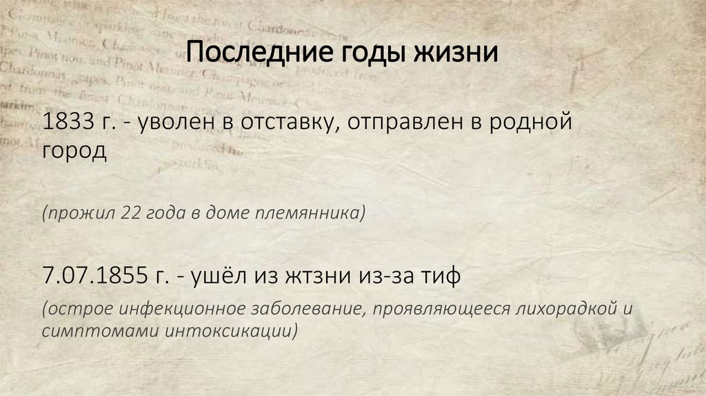 Последние годы жизни1833 г. - уволен в отставку, отправлен в родной