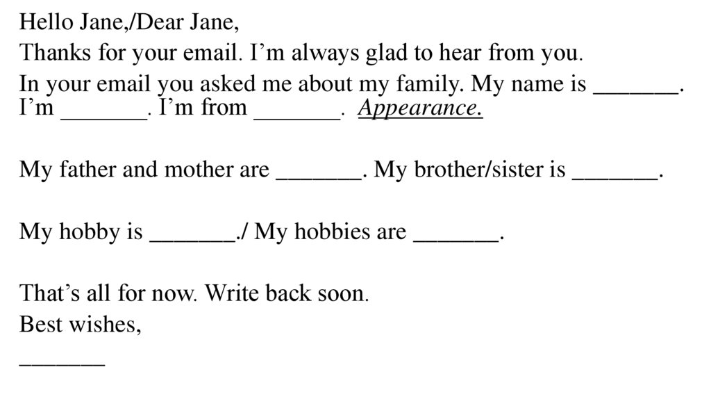 Hello Jane,/Dear Jane,Thanks for your email. I’m always glad to hear from you.