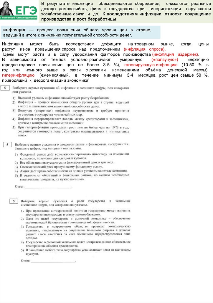 В результате инфляции обесцениваются сбережения, снижаются реальныедоходы домохозяйств, фирм и государства, при гиперинфляции нарушаются