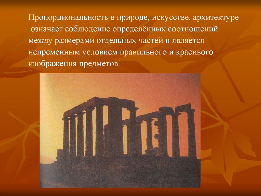 Пропорциональность в природе, искусстве, архитектуреозначает соблюдение определённых соотношений