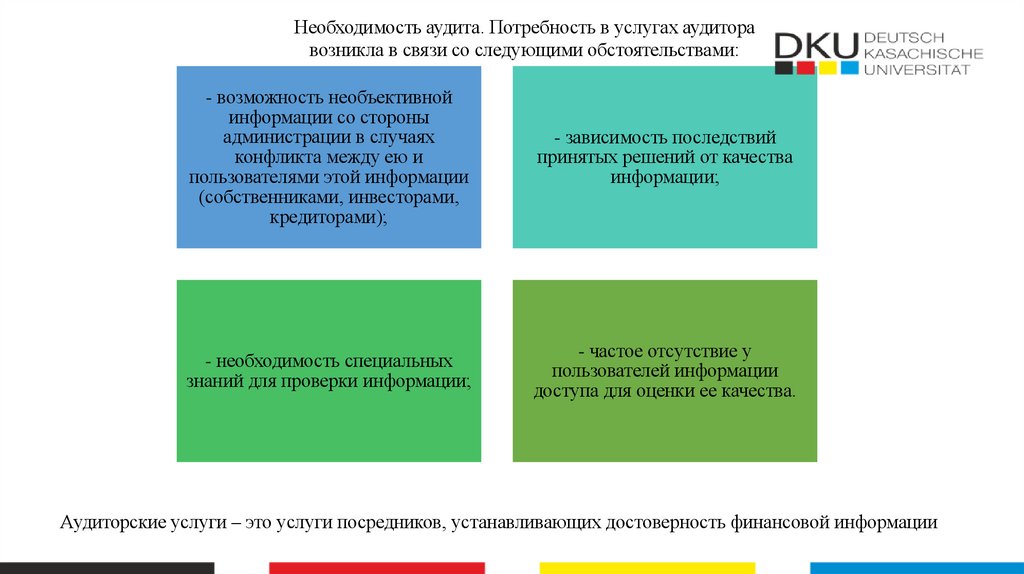 Аудиторские услуги – это услуги посредников, устанавливающих достоверность финансовой информации