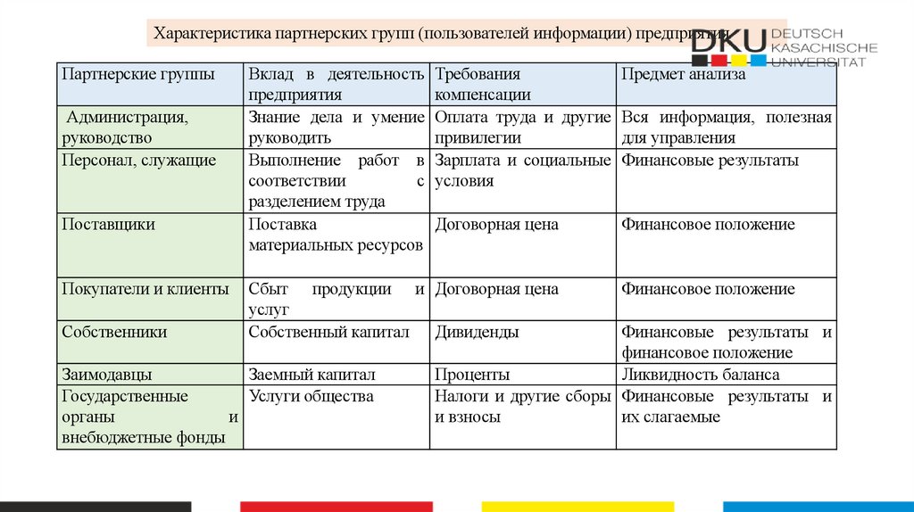 Характеристика партнерских групп (пользователей информации) предприятияПартнерские группы