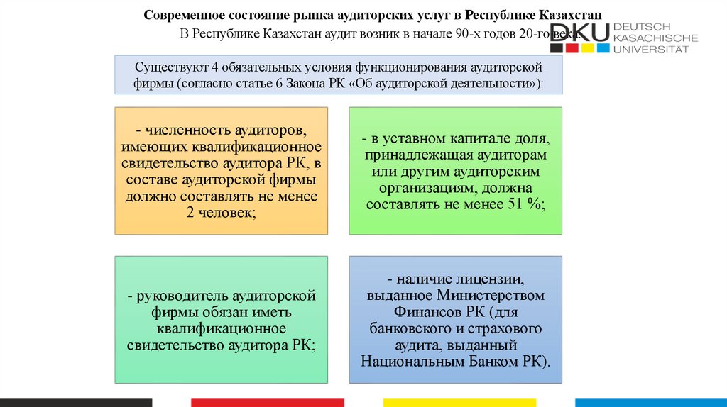 Современное состояние рынка аудиторских услуг в Республике КазахстанВ Республике Казахстан аудит возник в начале 90-х годов 20-го века.