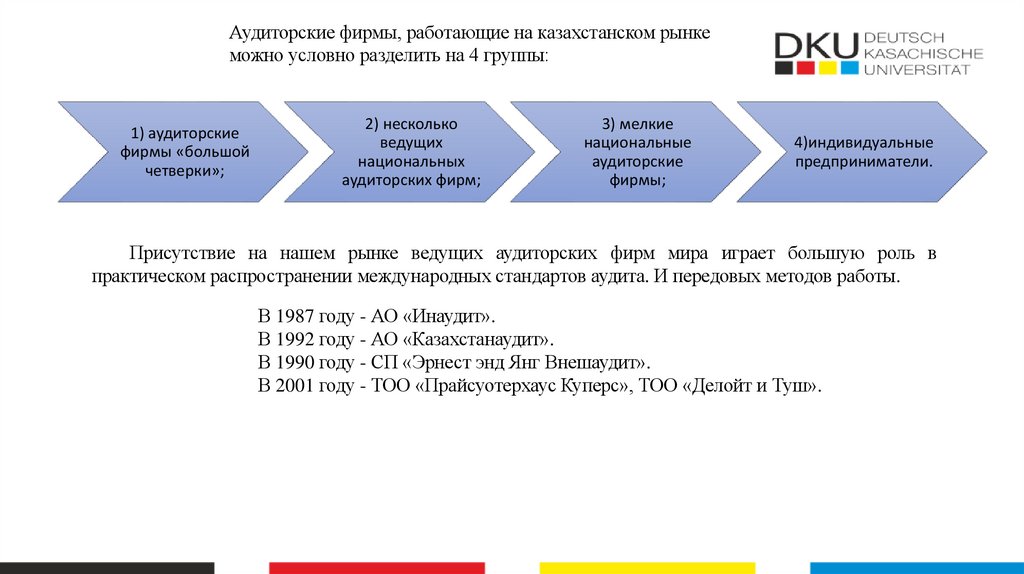 Аудиторские фирмы, работающие на казахстанском рынкеможно условно разделить на 4 группы: