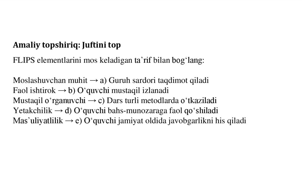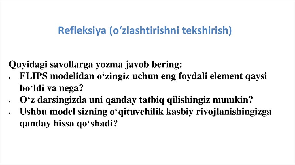 FLIPS modeli – bu o‘quvchiga faqat bilim berish emas, balki uni jamiyatda faol, mustaqil, mas’uliyatli valider shaxs sifatida shakllantirishga qaratilgan ta’lim yondashuvi.