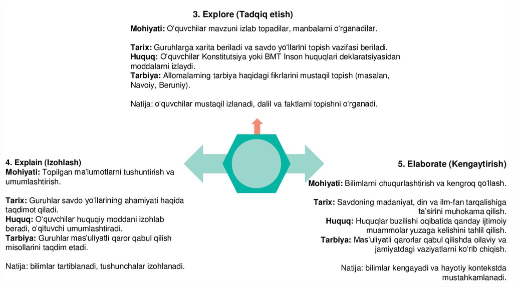 3. Explore (Tadqiq etish)Mohiyati: O‘quvchilar mavzuni izlab topadilar, manbalarni o‘rganadilar.