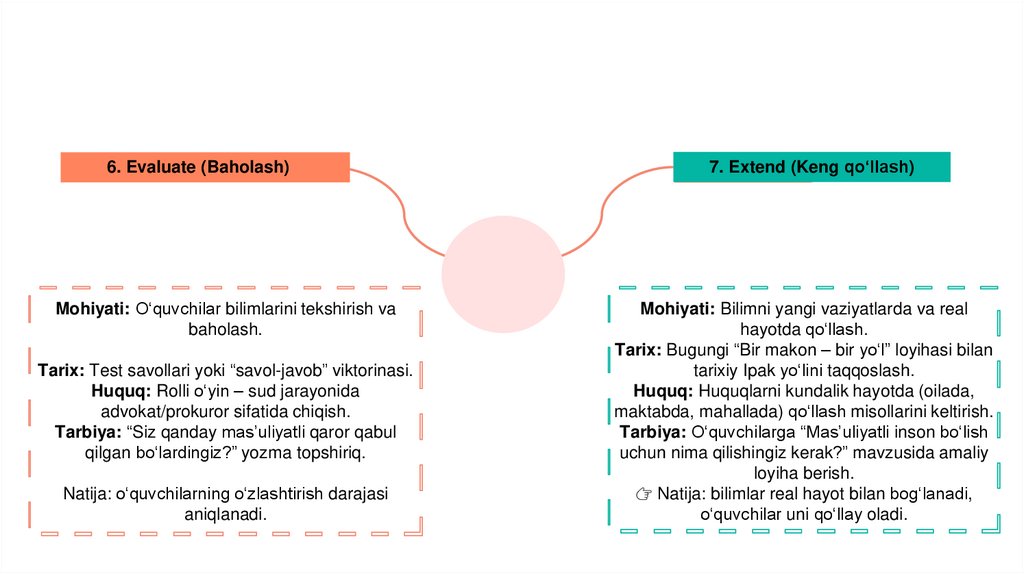 6. Evaluate (Baholash)Mohiyati: O‘quvchilar bilimlarini tekshirish va