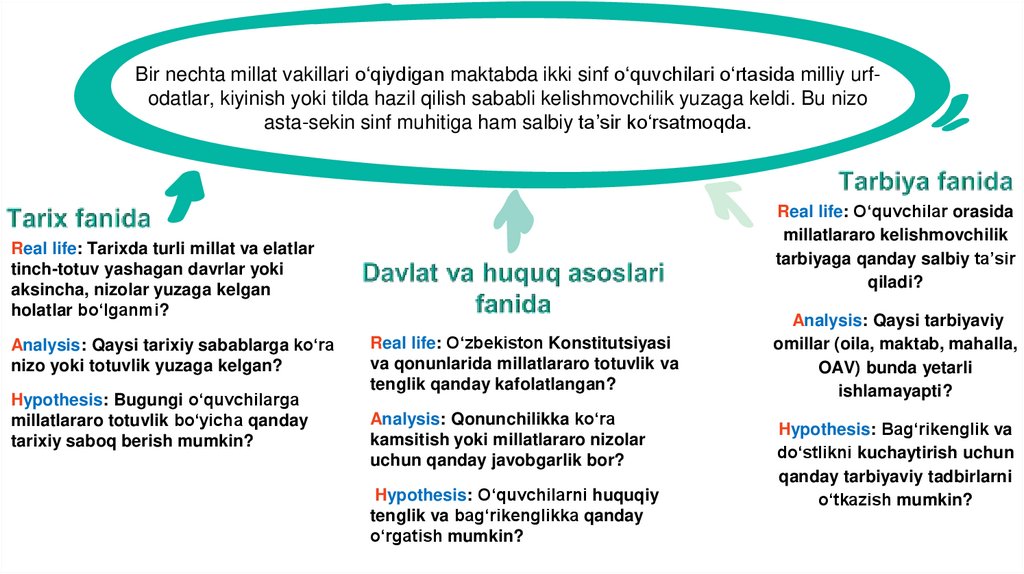 Bir nechta millat vakillari o‘qiydigan maktabda ikki sinf o‘quvchilari o‘rtasida milliy urfodatlar, kiyinish yoki tilda hazil qilish sababli kelishmovchilik yuzaga keldi. Bu nizoasta-sekin sinf muhitiga ham salbiy ta’sir ko‘rsatmoqda.