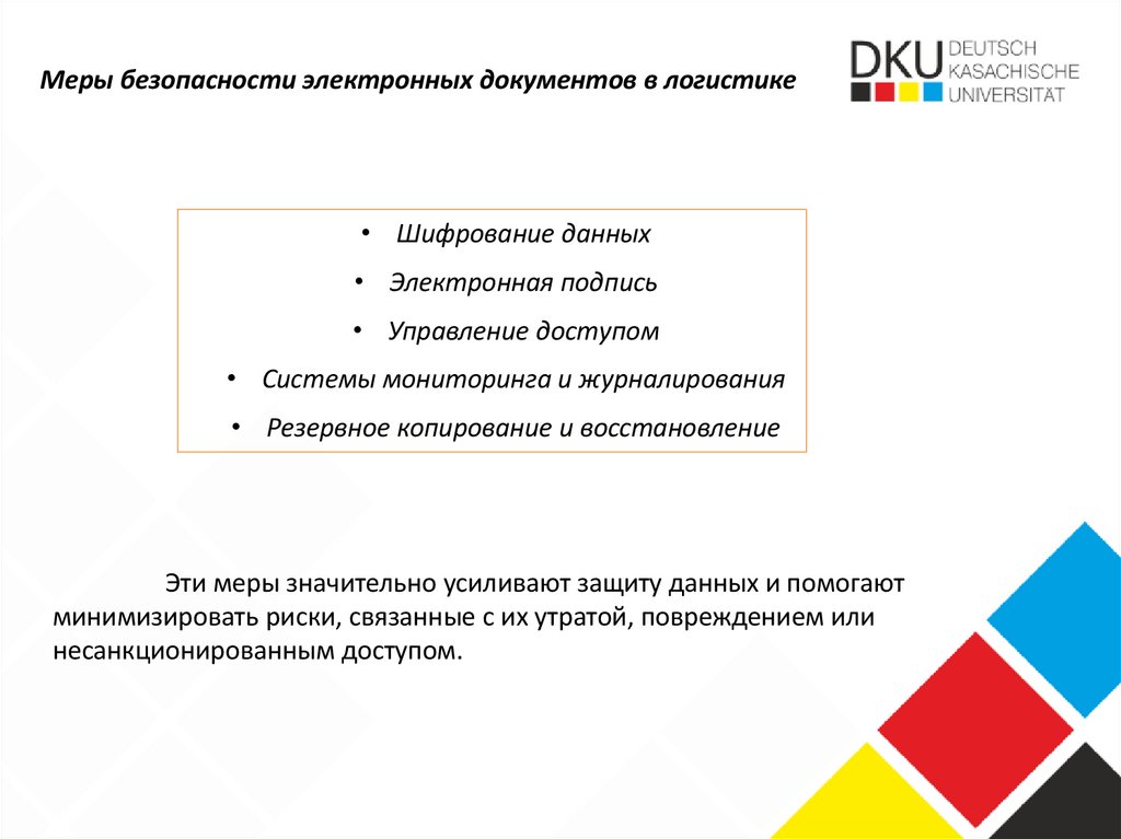 Меры безопасности электронных документов в логистике• Шифрование данных