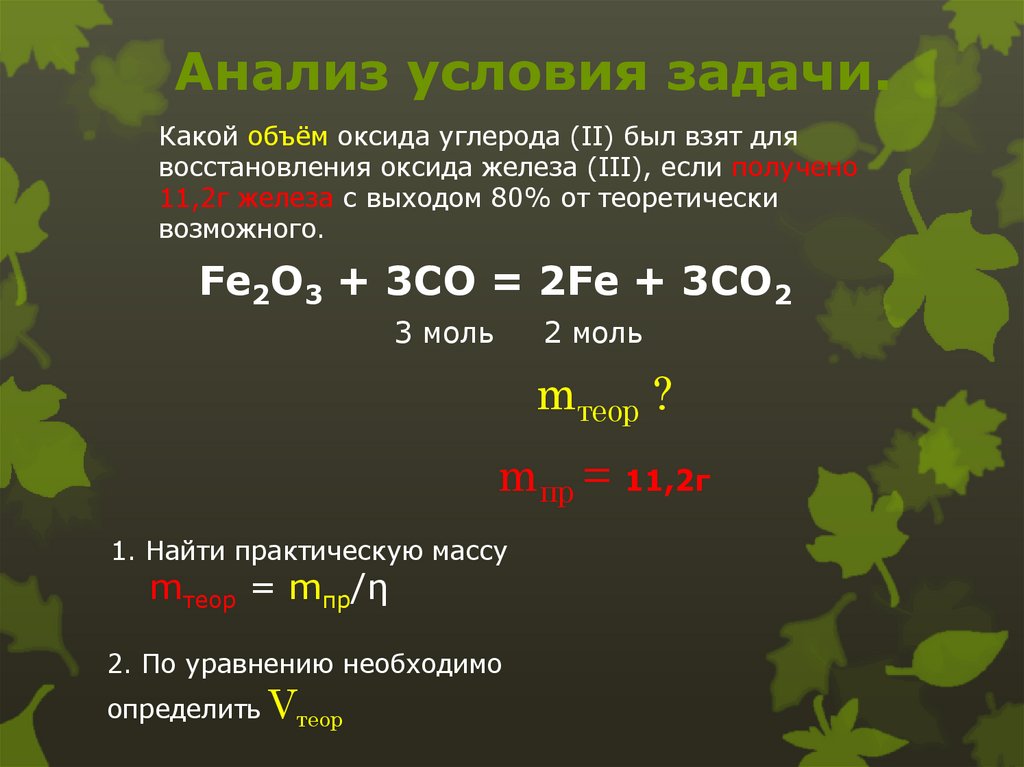 Анализ условия задачи.Какой объём оксида углерода (II) был взят для