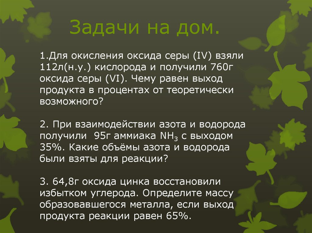 Задачи на дом.1.Для окисления оксида серы (IV) взяли