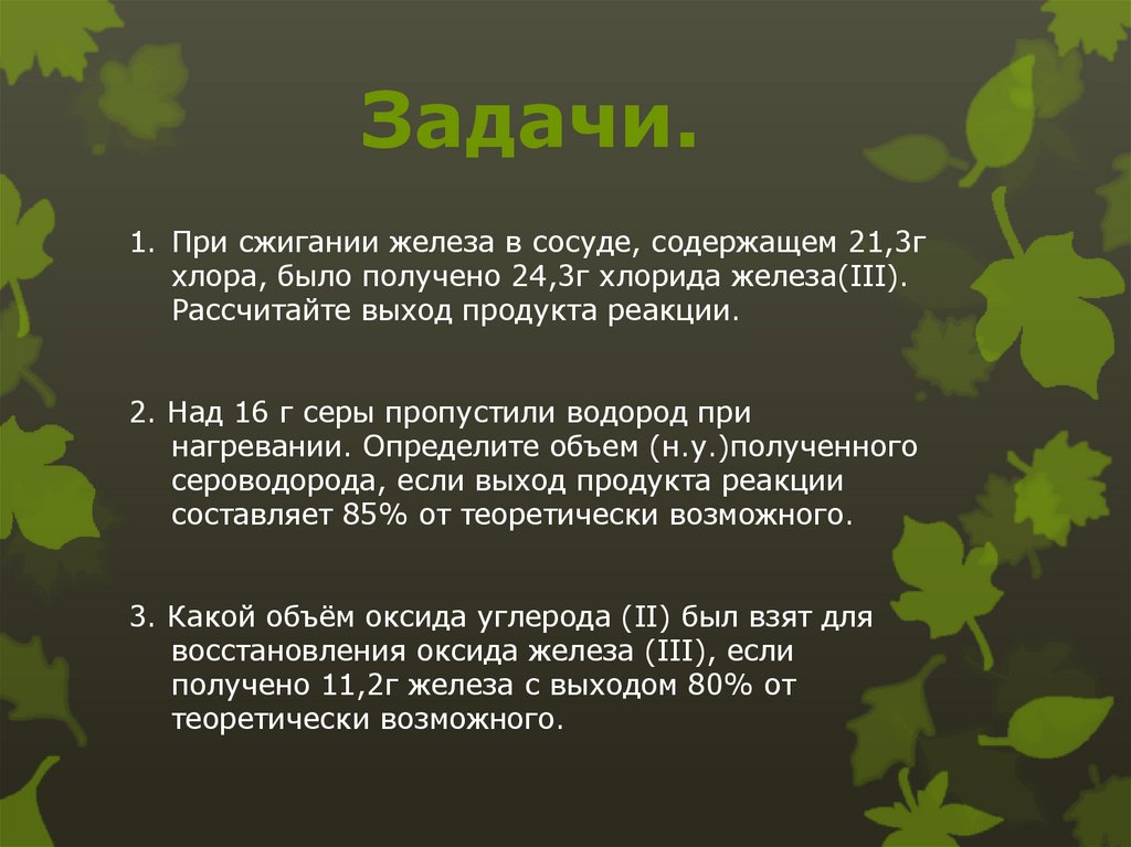 Задачи.1. При сжигании железа в сосуде, содержащем 21,3г