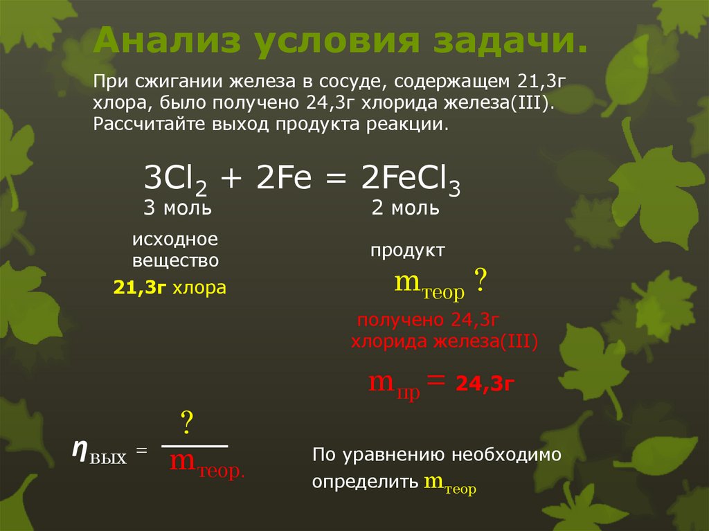 Анализ условия задачи.При сжигании железа в сосуде, содержащем 21,3г