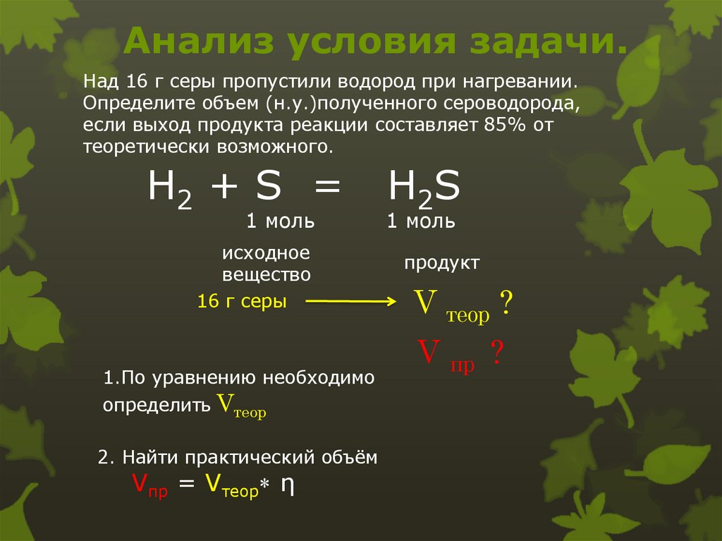 Анализ условия задачи.Над 16 г серы пропустили водород при нагревании.