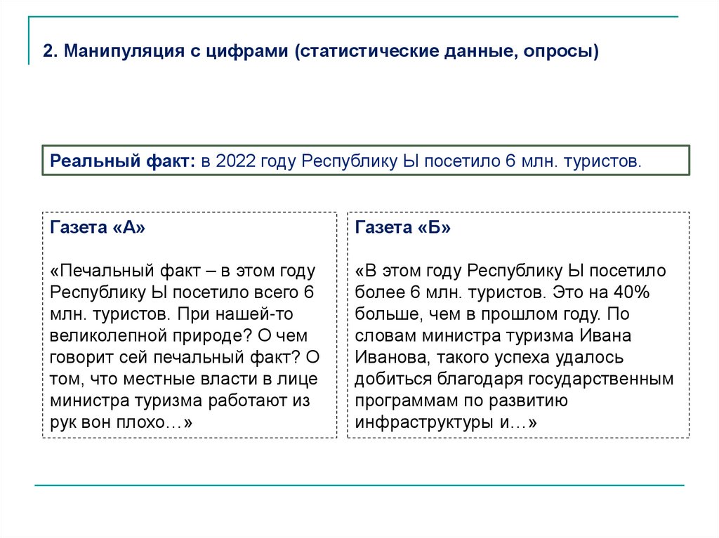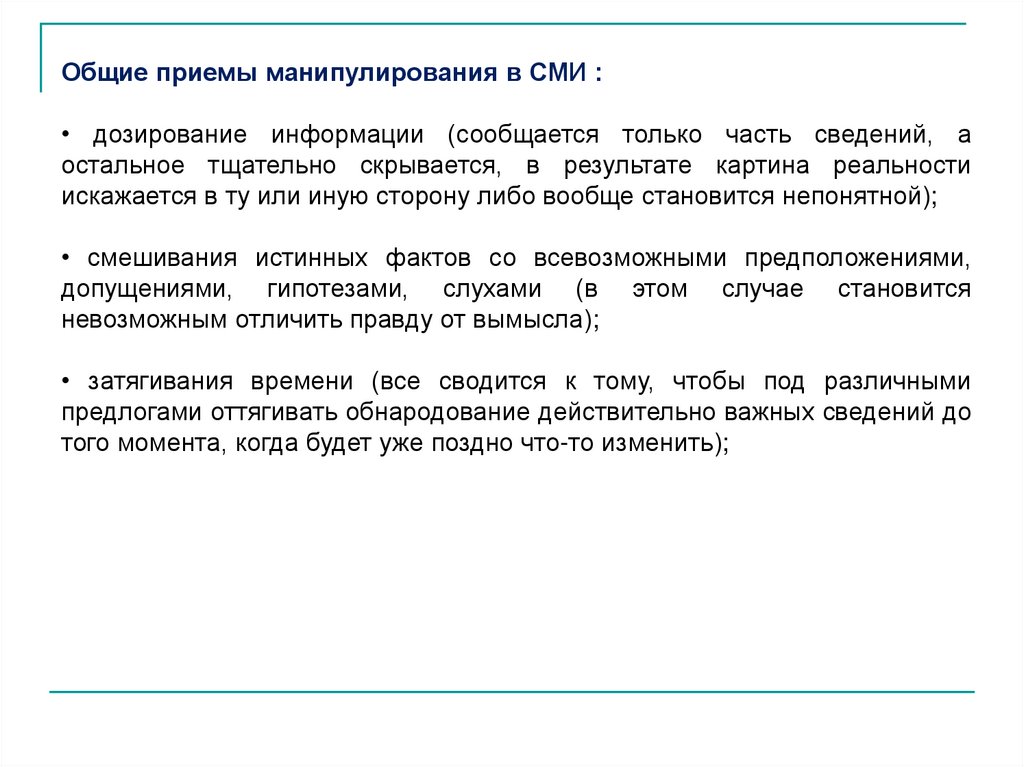Общие приемы манипулирования в СМИ :• дозирование информации (сообщается только часть сведений, а