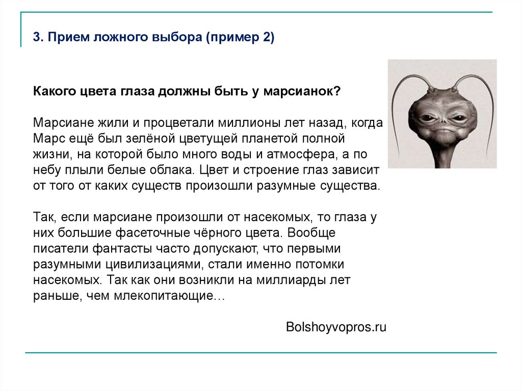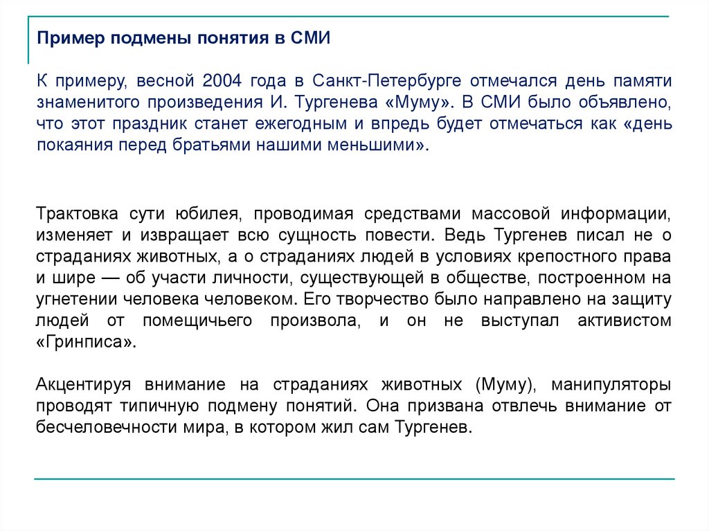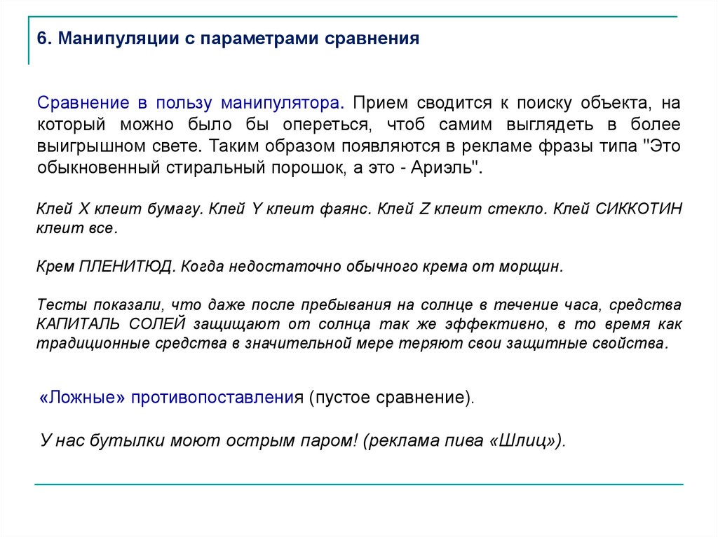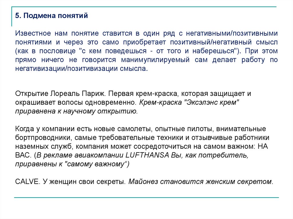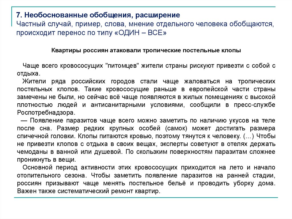7. Необоснованные обобщения, расширениеЧастный случай, пример, слова, мнение отдельного человека обобщаются,