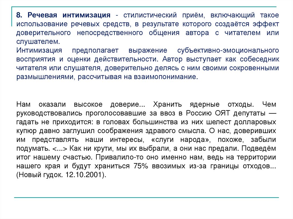 8. Речевая интимизация - стилистический приём, включающий такоеиспользование речевых средств, в результате которого создаётся эффект