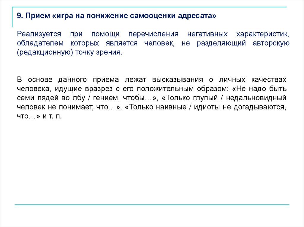 9. Прием «игра на понижение самооценки адресата»Реализуется при помощи перечисления негативных характеристик,