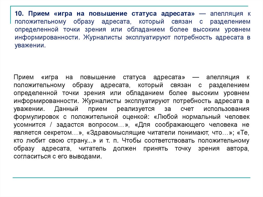 10. Прием «игра на повышение статуса адресата» — апелляция кположительному образу адресата, который связан с разделением