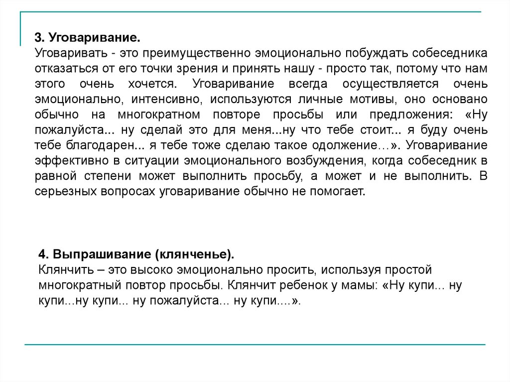3. Уговаривание.Уговаривать - это преимущественно эмоционально побуждать собеседника
