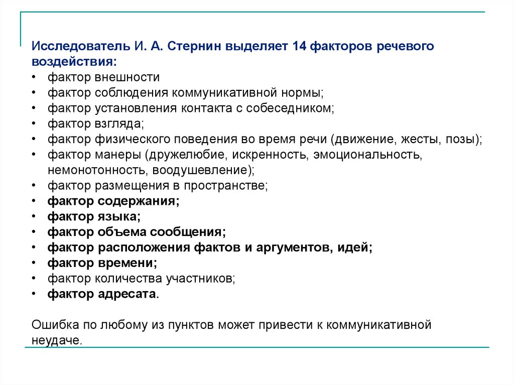 Исследователь И. А. Стернин выделяет 14 факторов речевоговоздействия: