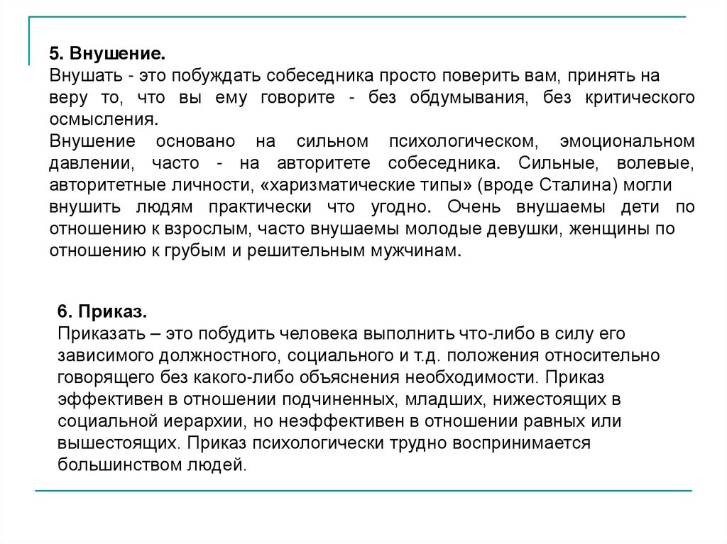 5. Внушение.Внушать - это побуждать собеседника просто поверить вам, принять на
