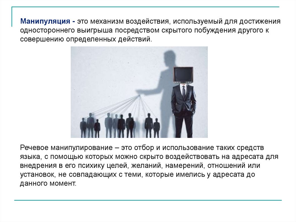 Манипуляция - это механизм воздействия, используемый для достиженияодностороннего выигрыша посредством скрытого побуждения другого к