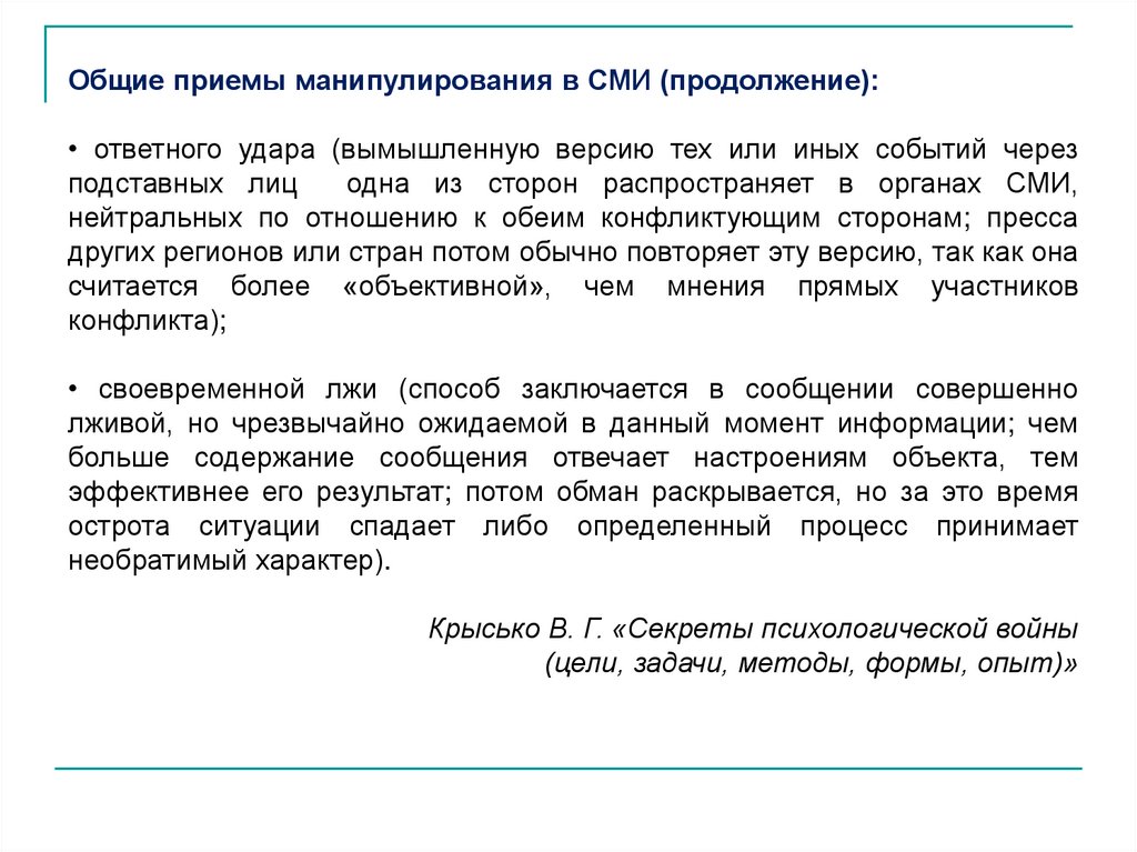 Общие приемы манипулирования в СМИ (продолжение):• ответного удара (вымышленную версию тех или иных событий через