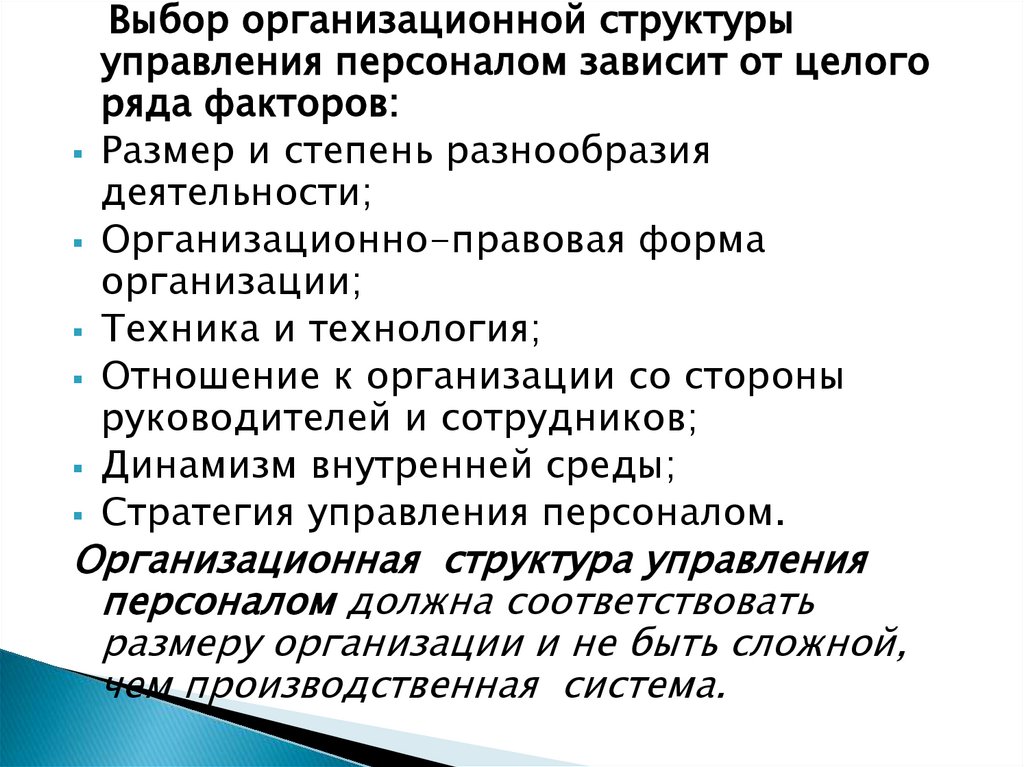 Выбор организационной структурыуправления персоналом зависит от целого