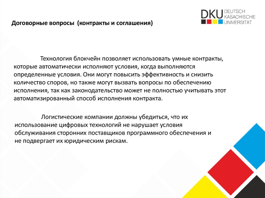 Договорные вопросы (контракты и соглашения)Технология блокчейн позволяет использовать умные контракты,
