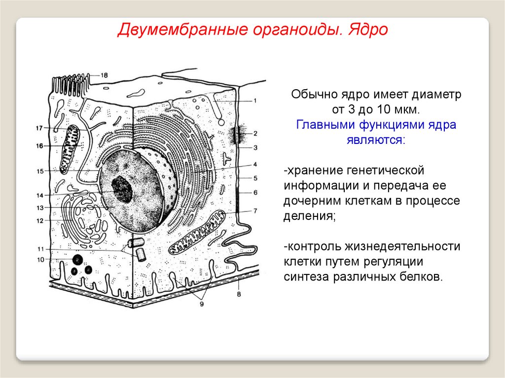 Двумембранные органоиды. ЯдроОбычно ядро имеет диаметр