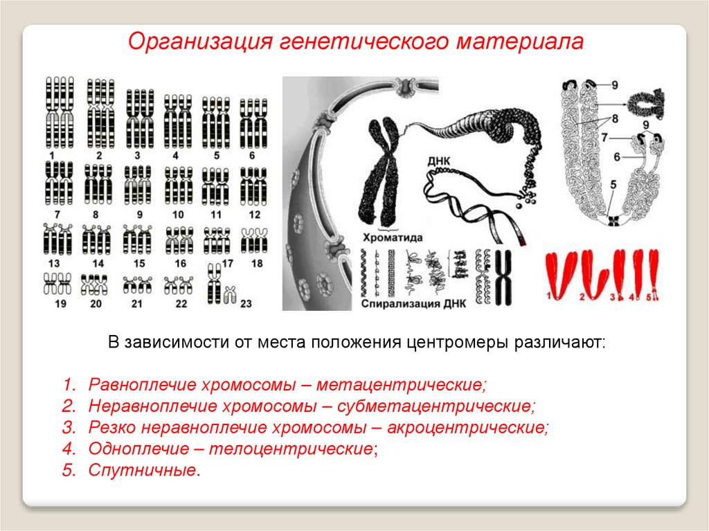 Организация генетического материалаВ зависимости от места положения центромеры различают:
