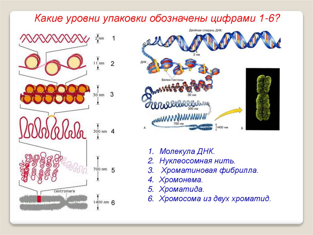 Какие уровни упаковки обозначены цифрами 1-6?1. Молекула ДНК.