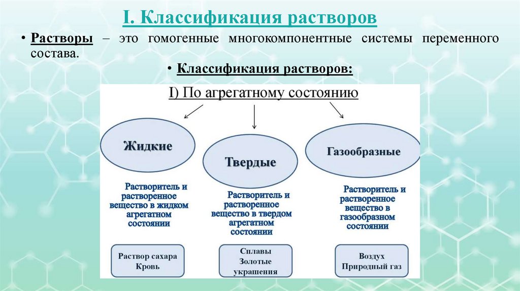 I. Классификация растворов• Растворы – это гомогенные многокомпонентные системы переменного