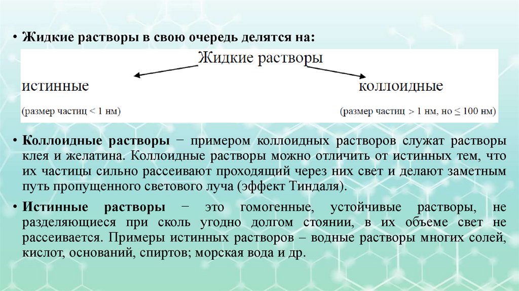 рассеивается. Примеры истинных растворов – водные растворы многих солей,