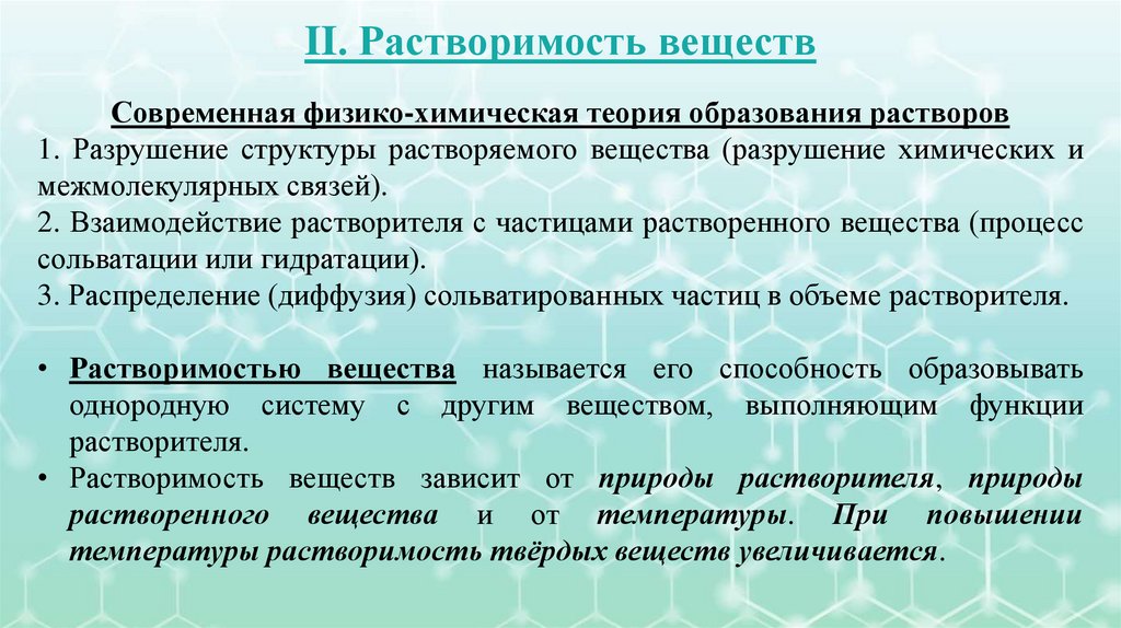 II. Растворимость веществСовременная физико-химическая теория образования растворов