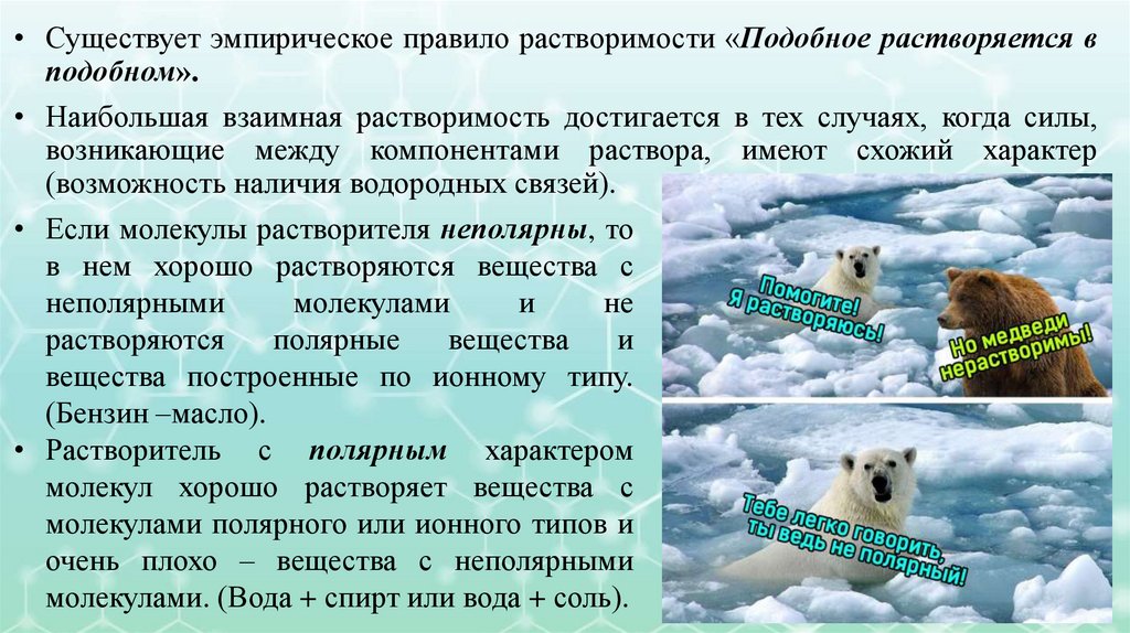 • Существует эмпирическое правило растворимости «Подобное растворяется вподобном».