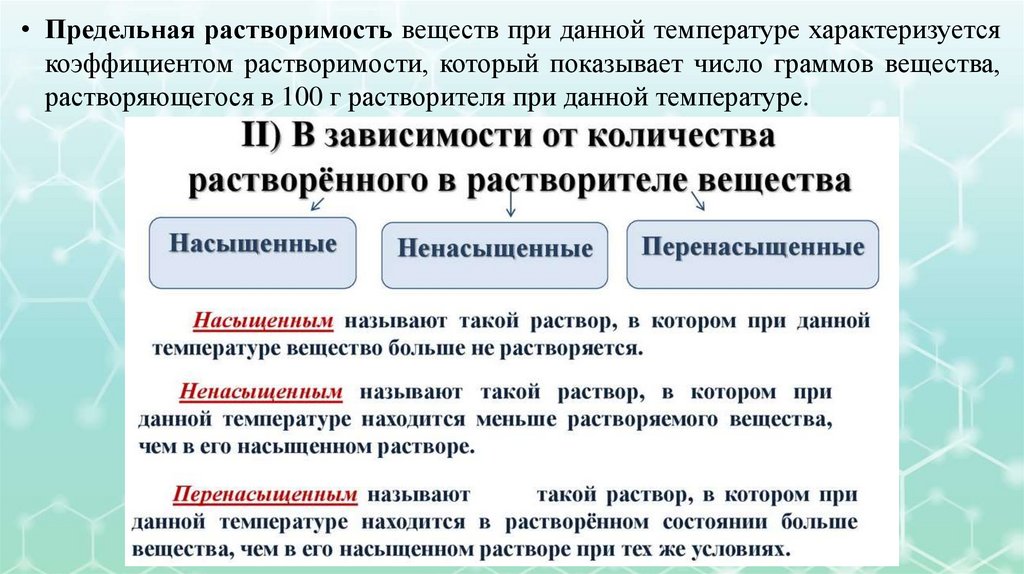 • Предельная растворимость веществ при данной температуре характеризуетсякоэффициентом растворимости, который показывает число граммов вещества,