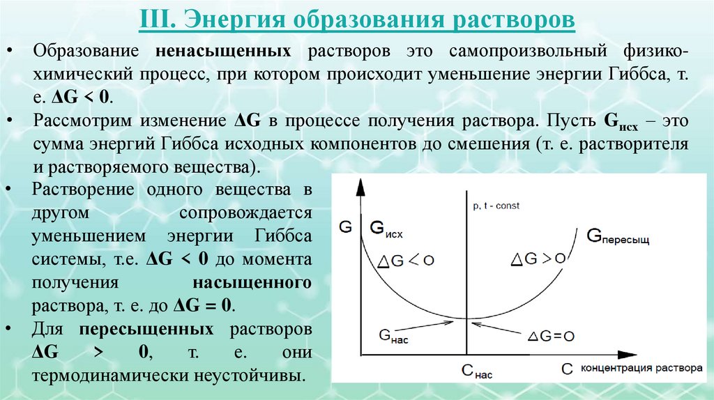 III. Энергия образования растворовОбразование ненасыщенных растворов это самопроизвольный физикохимический процесс, при котором происходит уменьшение энергии Гиббса, т.