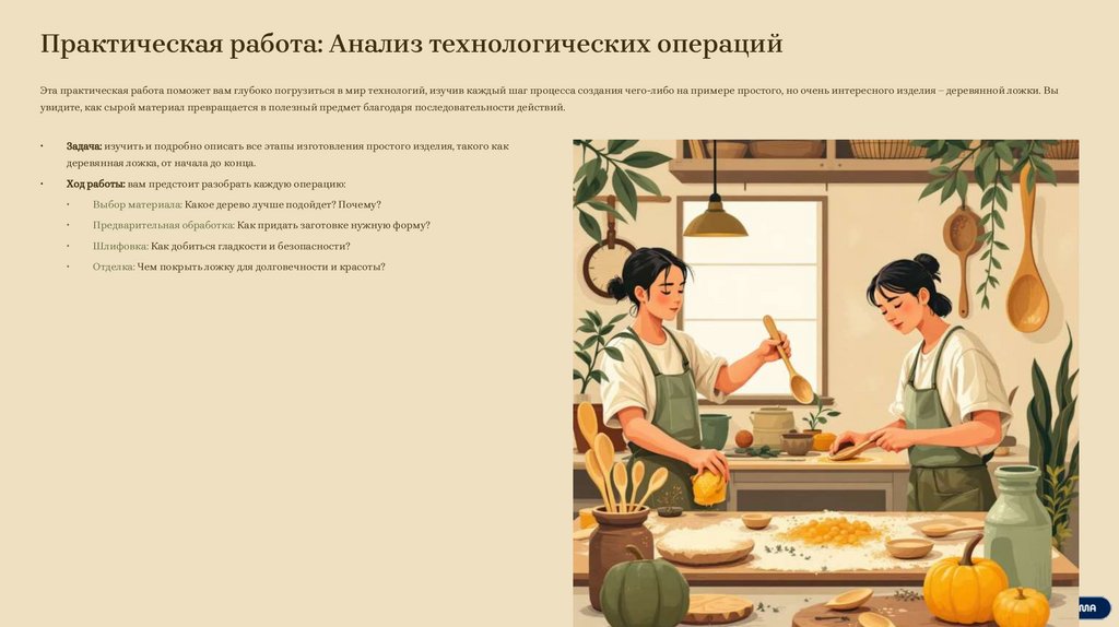 Практическая работа: Анализ технологических операцийЭта практическая работа поможет вам глубоко погрузиться в мир технологий, изучив каждый шаг процесса создания чего-либо на примере простого, но очень интересного изделия – деревянной ложки. Вы