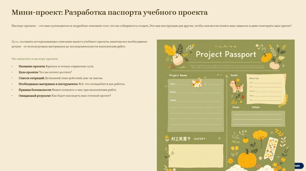 Мини-проект: Разработка паспорта учебного проектаПаспорт проекта — это ваш путеводитель и подробное описание того, что вы собираетесь создать. Это как инструкция для других, чтобы они могли понять ваш замысел и даже повторить ваш проект!