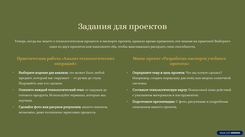Задания для проектовТеперь, когда вы знаете о технологическом процессе и паспорте проекта, пришло время применить эти знания на практике! Выберите