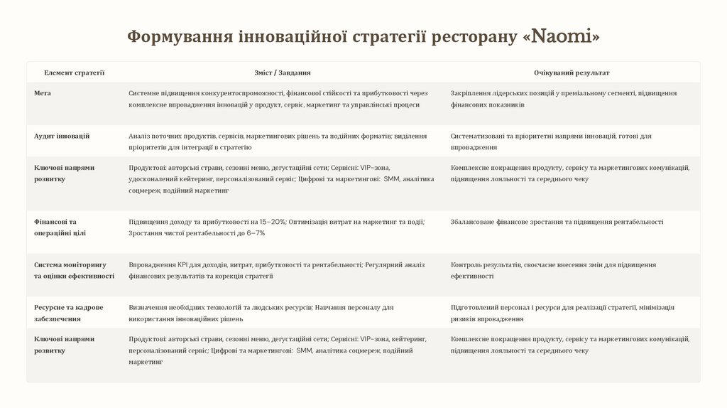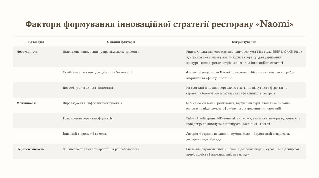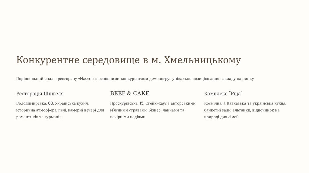 Конкурентне середовище в м. ХмельницькомуПорівняльний аналіз ресторану «Naomi» з основними конкурентами демонструє унікальне позиціювання закладу на ринку