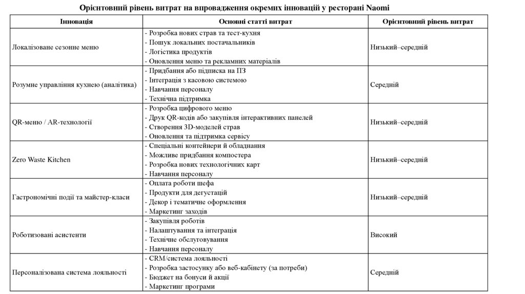 Орієнтовний рівень витрат на впровадження окремих інновацій у ресторані NaomiІнновація